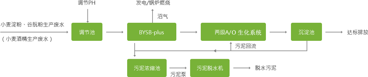 小麦淀粉、谷朊粉、小麦酒精等废水收集后进入到调节池,在调节池内通过搅拌机的搅拌作用,对废水进行水质均一、水量均衡。然后通过泵提升进入BYSB-plus反应器,在BYSB-plus反应器内降解废水中绝大部分有机物染物,同时产生大量可燃气体:沼气,沼气进入锅炉房助燃或者发电;BYSB-plus出水自流经缓冲池后进入两级A/O生化系统,在O段利用好氧菌的代谢作用,将水中的有机污染物得到去除,氨氮通过硝化作用,转化为硝态氮,再回流到A段,利用反硝化菌的反硝化作用达到脱氮的目的。两级A/O系统出水在沉淀池进行泥水分离后,沉淀污泥回流至A/O系统继续参与反应。沉淀池上清液达标排放。沉淀污泥排放至污泥处理系统进行处理。
